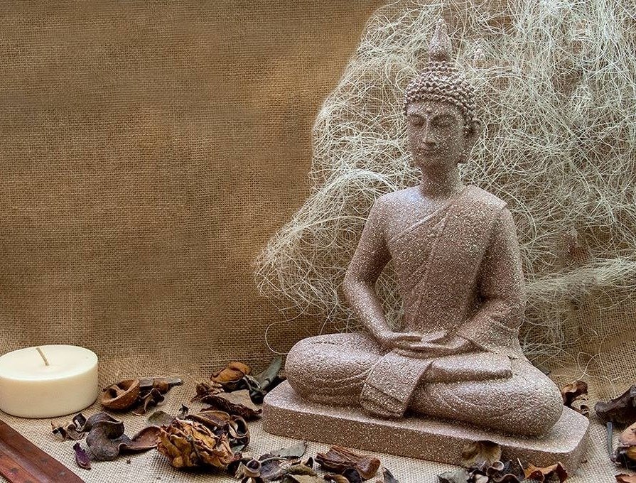 Το άγαλμα του Βούδα σε στάση διαλογισμού είναι από συμπαγές υλικό, χρωματισμένο στο χέρι σε χρώμα της άμμου. Για το φινίρισμα του έχουν χρησιμοποιηθεί οικολογικά χρώματα κιμωλίας, ανθεκτικά στο χρόνο και φιλικά προς το περιβάλλον.