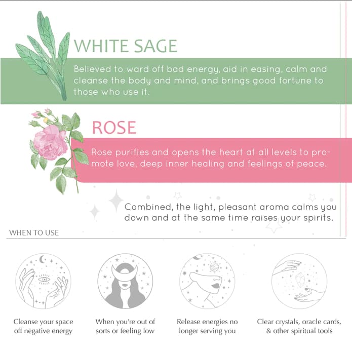 Το Θεραπευτικό Μείγμα Αιθέριων Ελαίων White Sage & Rose είναι εμποτισμένο με φυσικά εκχυλίσματα Φασκόμηλου που συνδυάζονται όμορφα με το Τριαντάφυλλο για να τονίσουν την οικειότητα και τον αισθησιασμό. Αυτό το εκπληκτικό μείγμα θα σας βοηθήσει να επαναφέρετε το ρομαντισμό και τη θετικότητα στην ατμόσφαιρα. Χρήσιμο για την απομάκρυνση των αρνητικών ενεργειών από εξωτερικούς και εσωτερικούς χώρους, το μείγμα White Sage & Rose θα ηρεμήσει τη διάθεσή σας και θα εξαγνίσει το σπίτι.