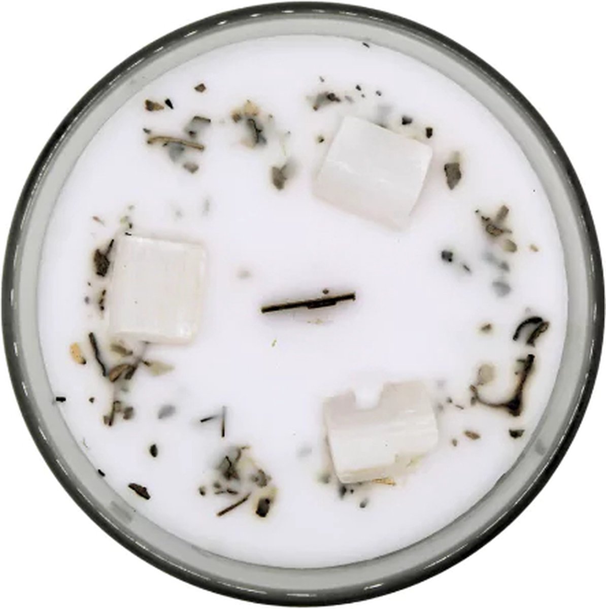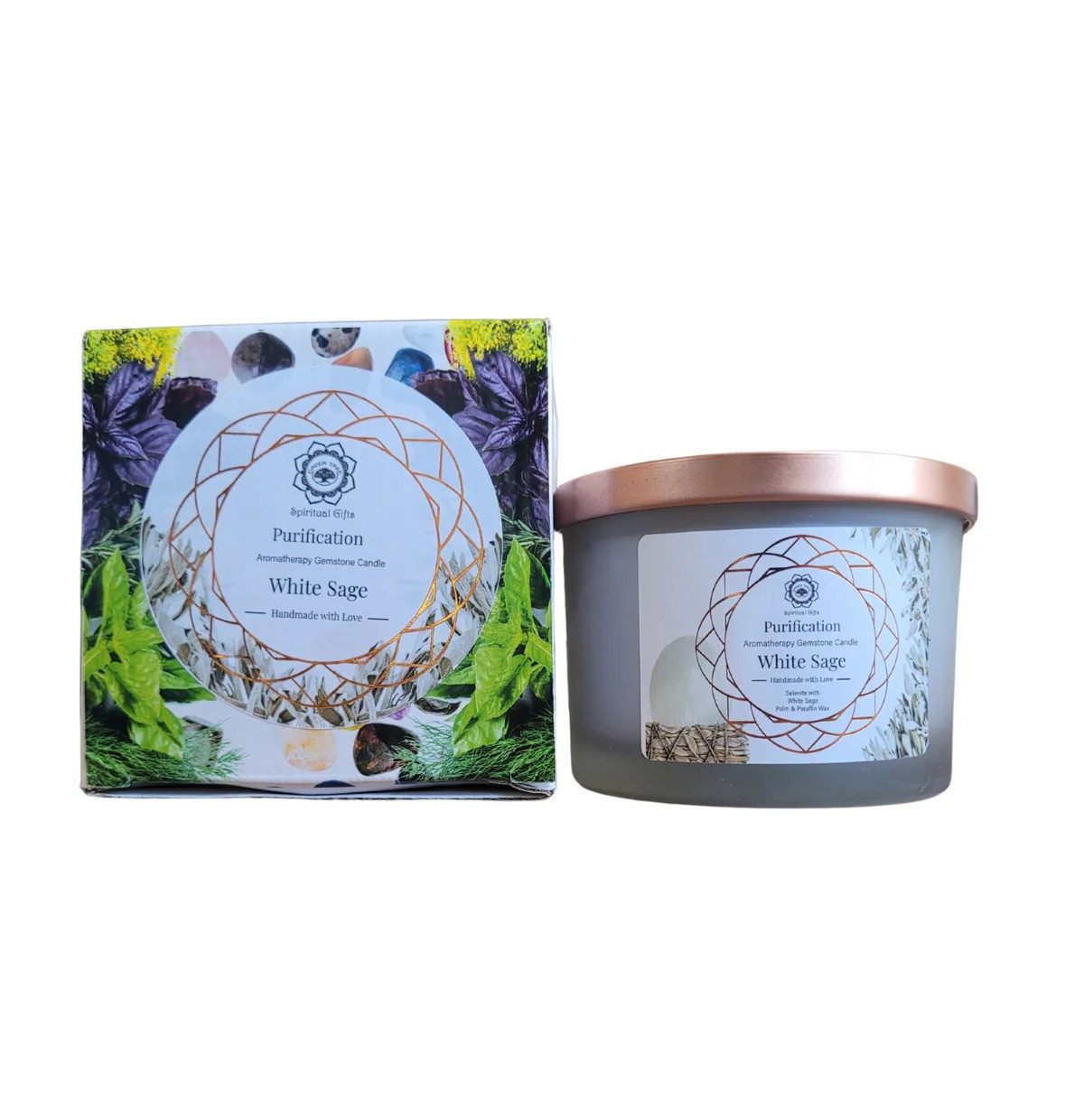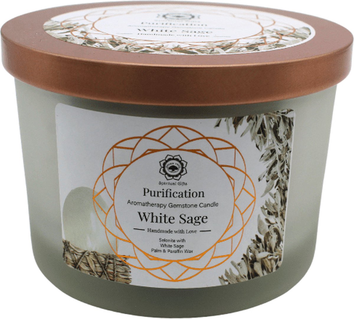 Είναι φτιαγμένο με πραγματικούς πολύτιμους λίθους Σεληνίτη, φυσικό κερί σόγιας και αποξηραμένο λευκό φασκόμηλο για πνευματικό καθαρισμό.