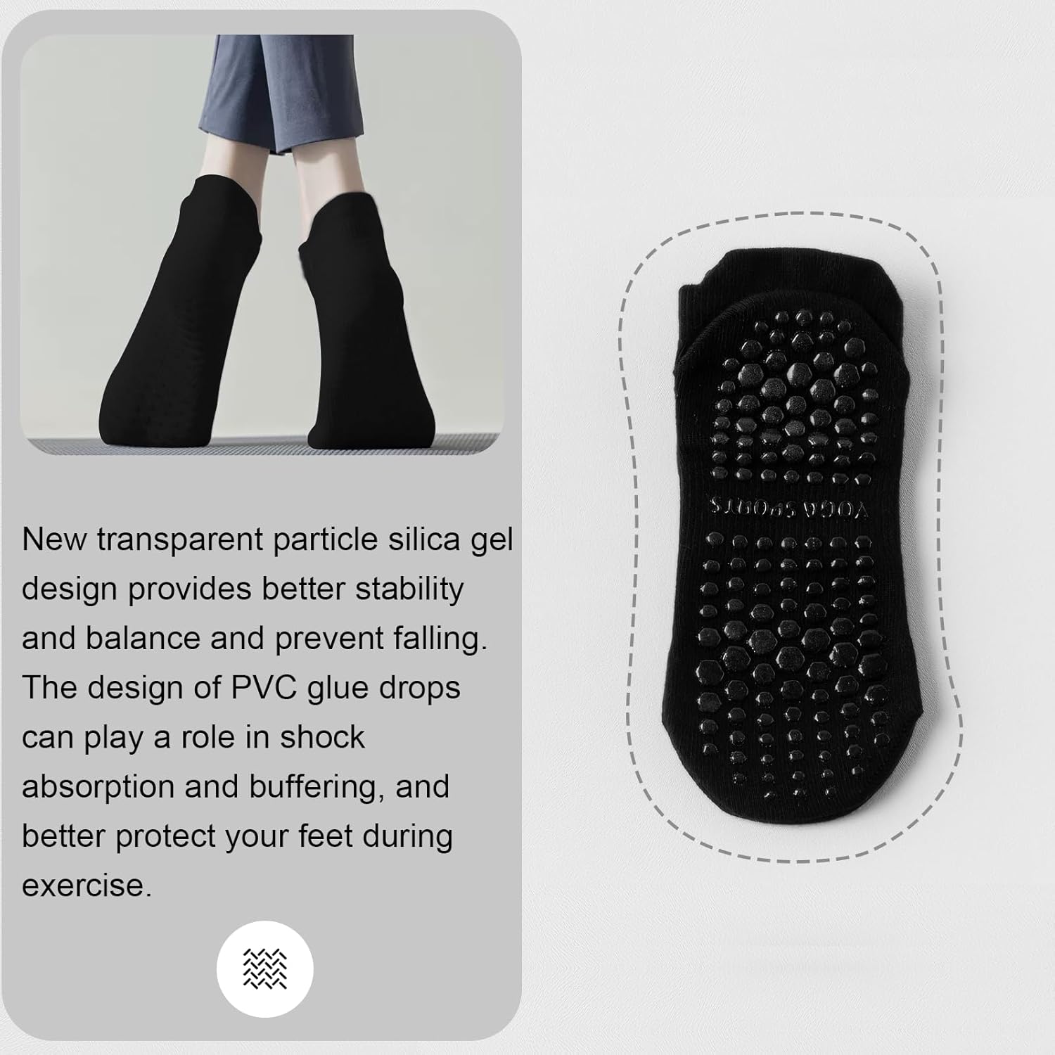 Με τα αντιολισθητικά σοσόνια για Γιόγκα και Πιλάτες έχετε τη δυνατότητα να εκτελέσετε την πρακτική σας ακόμα και χωρίς την χρήση στρώματος, χάρη στις ειδικές κουκκίδες των πελμάτων οι οποίες παρέχουν επιπλέον κράτημα, άνεση και σταθερότητα.