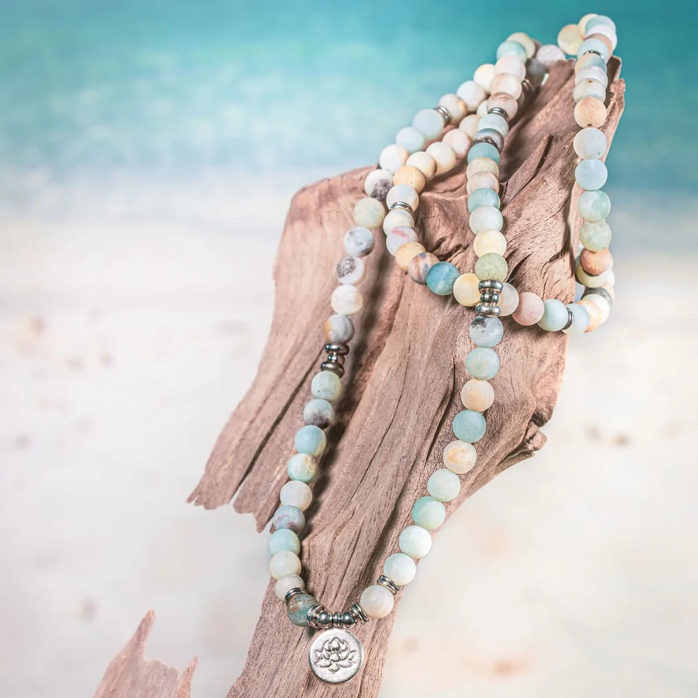 Θιβετιανό Mala Διαλογισμού που αποτελείται από 108 πολύτιμους λίθους Αμαζονίτη και ένα κεντρικό σχέδιο Lotus.